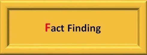 When planned and executed properly, FACT- FINDING provides a solid foundation for conducting analyses, forming conclusions, generating options and formulating sound recommendations. The Fact-finding process aligns with the initiating and planning elements of the PMBOK® guide. It involves meeting with stakeholders, researching documents or existing data, interviewing employees and outside resources to develop the scope of the project. The techniques employed will depend on the project or issue under consideration. What is constant across all fact-finding missions is the need for a plan to guide your efforts.